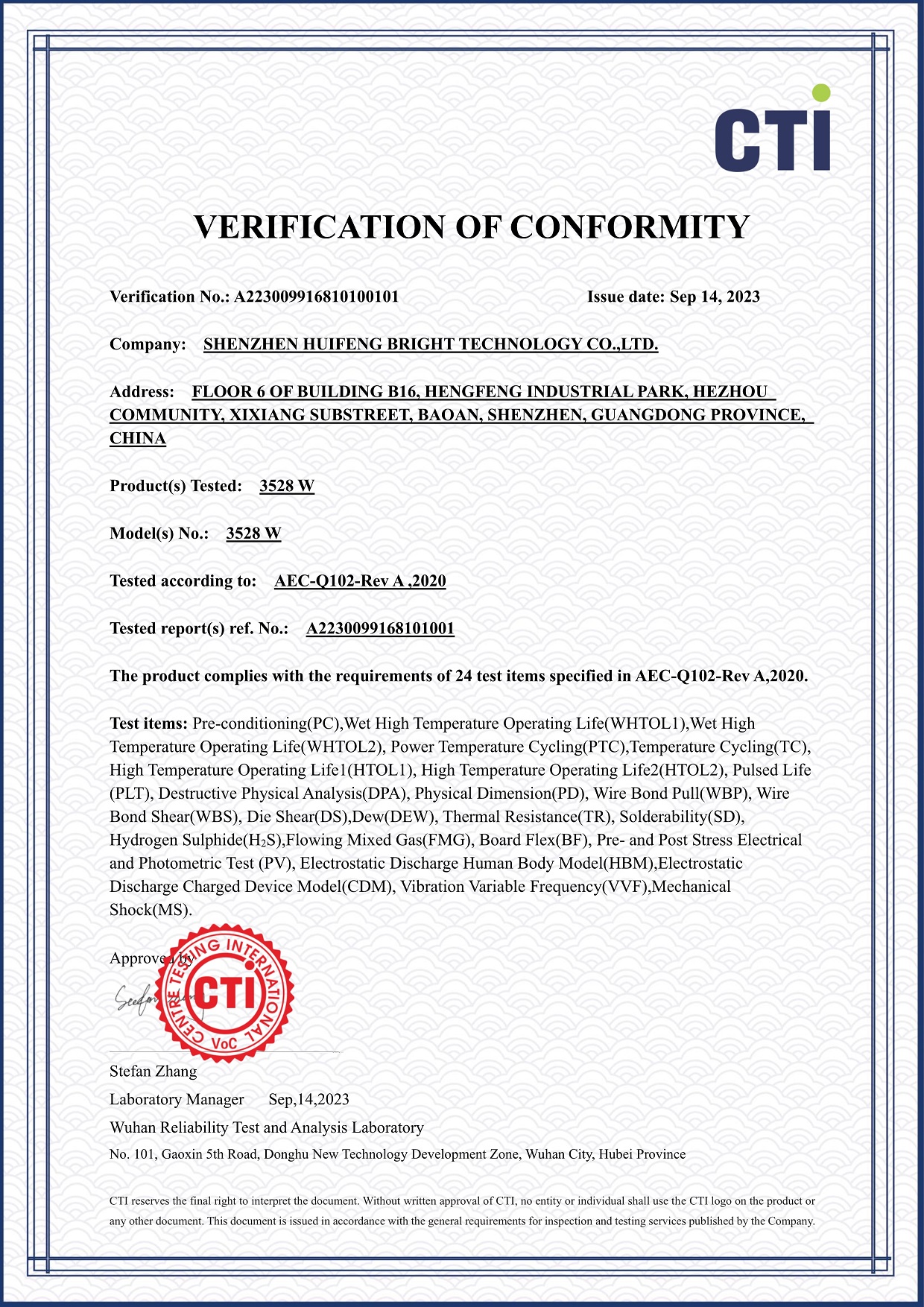 (喜訊)近日,華測(cè)檢測(cè)認(rèn)證集團(tuán)股份有限公司協(xié)助國內(nèi)LED自主品牌企業(yè)惠鋒光亮科技,在原有2214品類系列封裝產(chǎn)品的基礎(chǔ)上,經(jīng)過6個(gè)月之久AEC-Q102新標(biāo)準(zhǔn)的嚴(yán)苛驗(yàn)證,再次順利拓展3535系列、3528系列、3528RGB系列,3433RGB系列等多個(gè)平臺(tái)品類通過國際汽車電子協(xié)會(huì)AEC-Q102 可靠性質(zhì)量驗(yàn)證規(guī)范認(rèn)可?;蒌h光亮科技作為國內(nèi)首批自主研發(fā)產(chǎn)品標(biāo)準(zhǔn)達(dá)到車規(guī)級(jí)的企業(yè)之一,此次的品類延伸,為促進(jìn)車載光源應(yīng)用場(chǎng)景進(jìn)一步拓寬,廣泛適用于按鍵顯示、貫穿燈、剎車燈、氛圍燈、內(nèi)飾照明等領(lǐng)域提供了堅(jiān)實(shí)的基礎(chǔ)及更多可能;